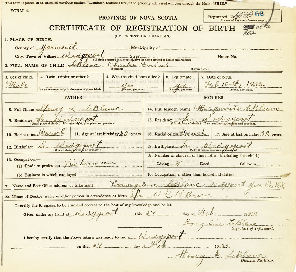21. Name and Post Office address of Informant Evangeline LeBlanc Wedgeport, Yarmouth N.S.
