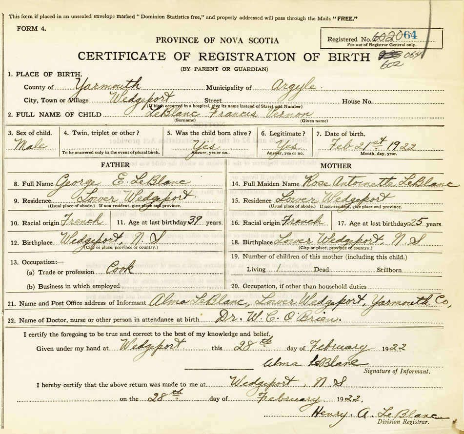 2. FULL NAME OF CHILD LeBlanc, Francis Vernon