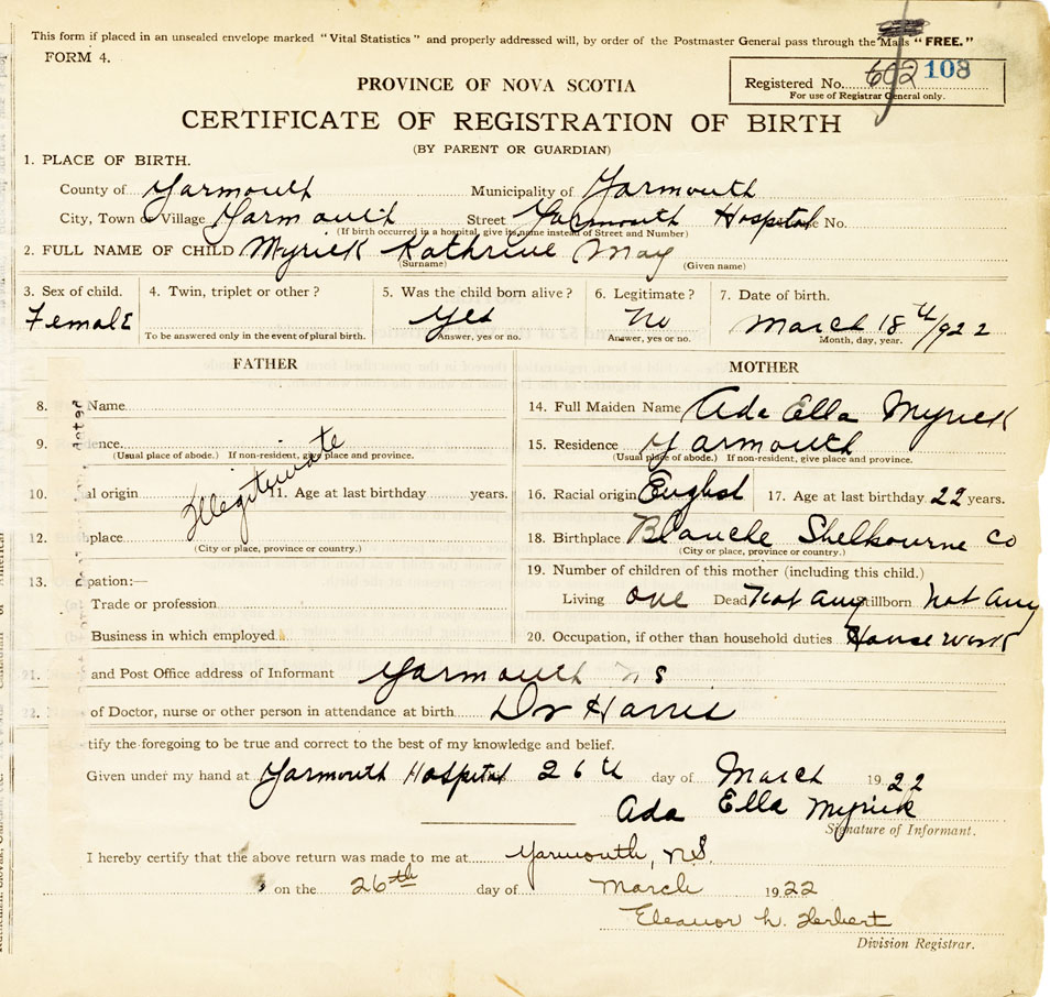 21. Name and Post Office address of Informant Ada Ella Myrick Yarmouth N.S.