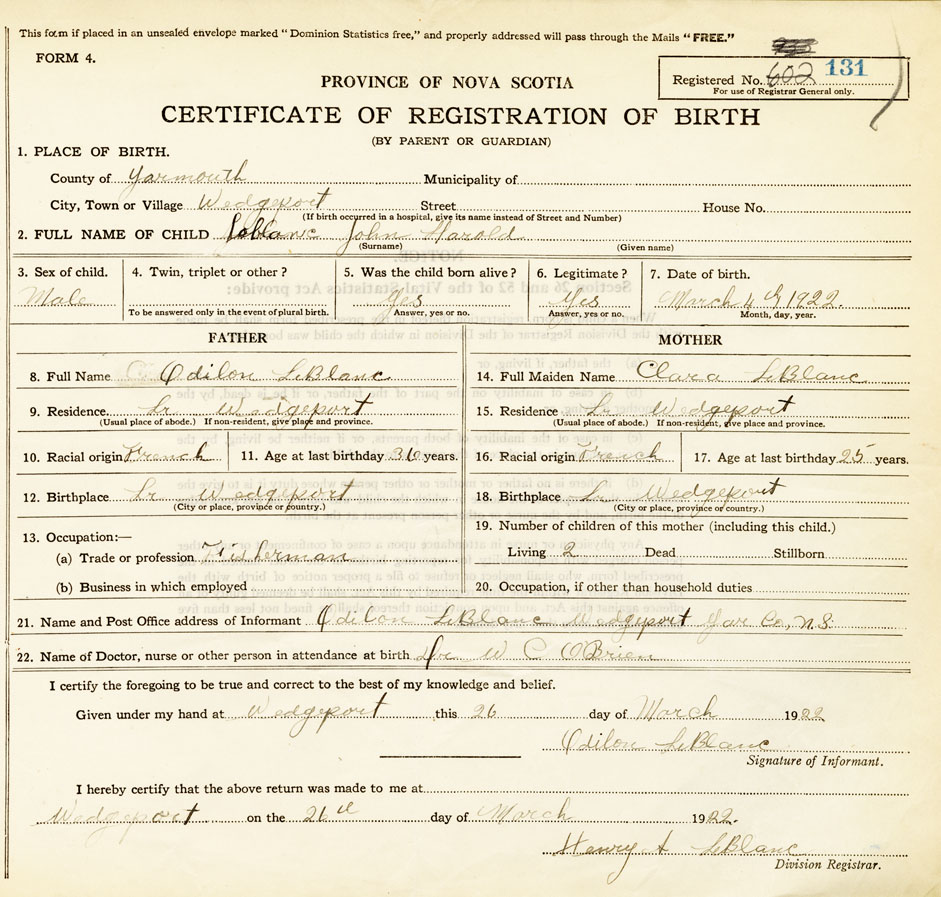 21. Name and Post Office address of Informant Odilon LeBlanc Wedgeport, Yar.