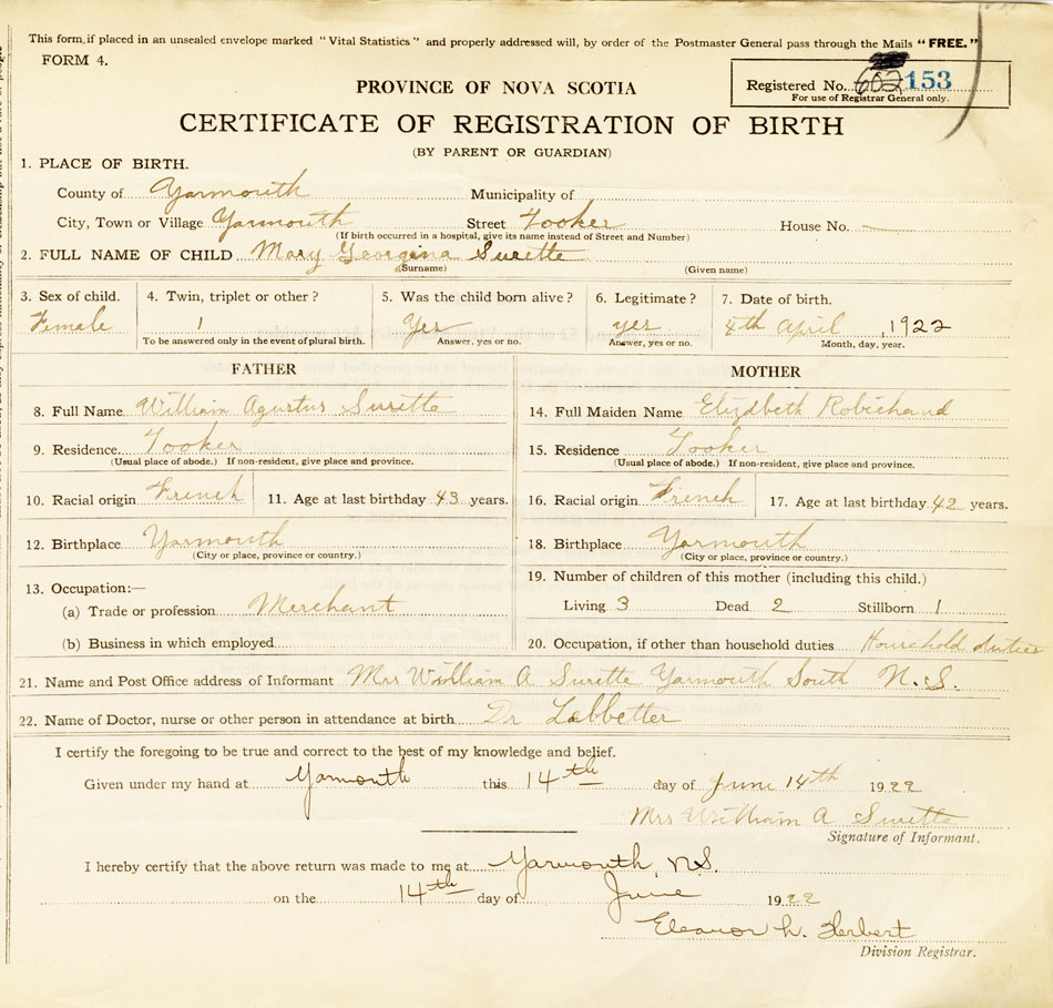 21. Name and Post Office address of Informant Mrs William A Surette Yarmouth South