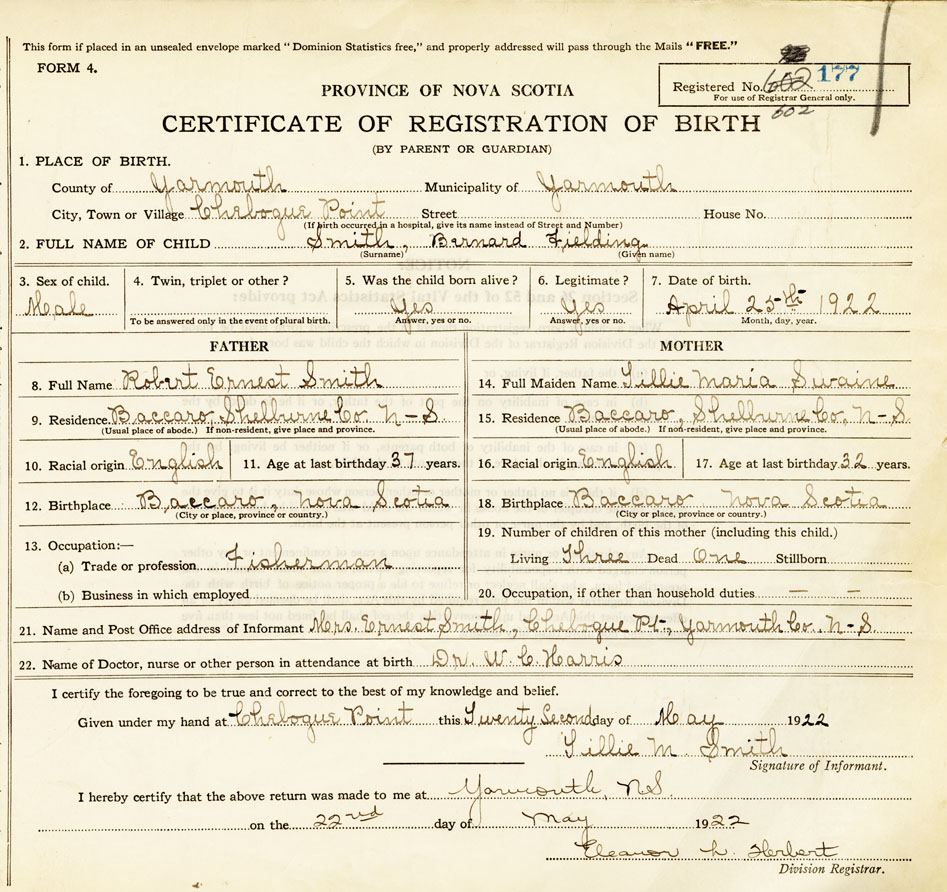 21. Name and Post Office address of Informant Lillie M Smith Chebogue Pt, Yarmouth Co