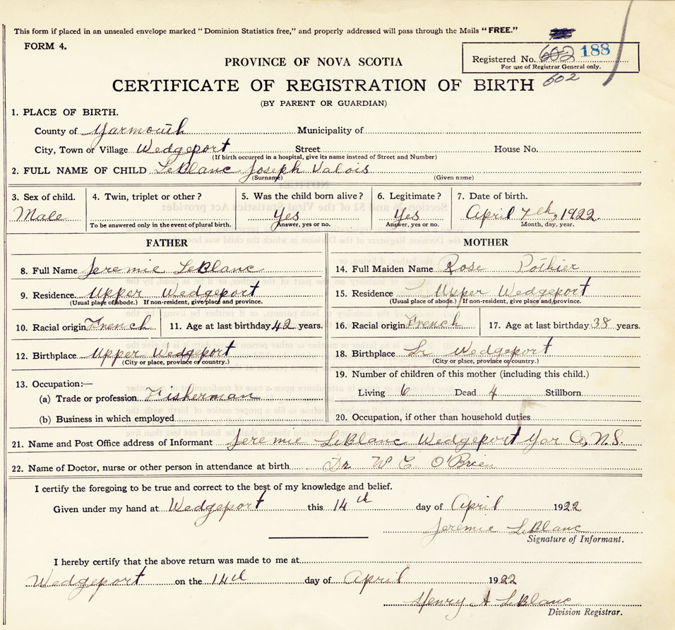 2. FULL NAME OF CHILD LeBlanc, Joseph Valois
