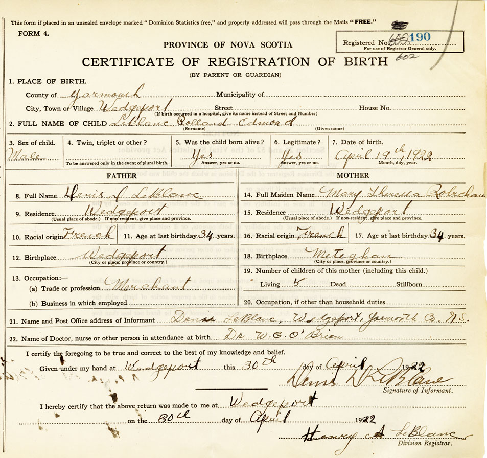 21. Name and Post Office address of Informant Denis D LeBlanc Wedgeport, Yarmouth Co