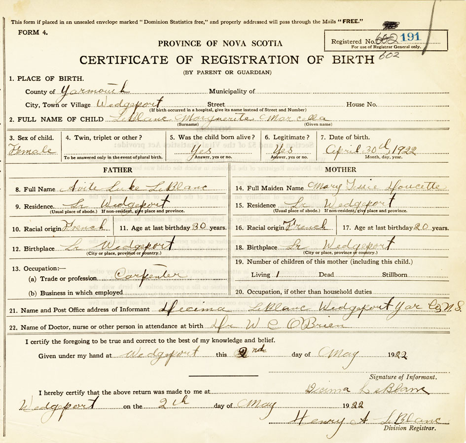 21. Name and Post Office address of Informant Decima LeBlanc Wedgeport, Yar.