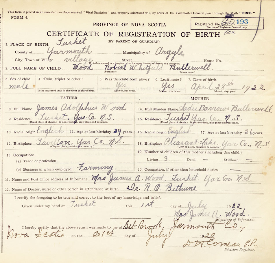 21. Name and Post Office address of Informant Mrs James A Wood Tusket, Yar.