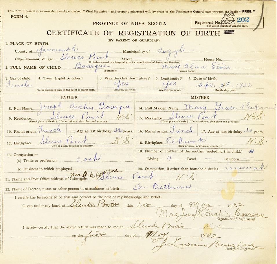 21. Name and Post Office address of Informant Mrs Joseph Archie Bourque Sluice Point