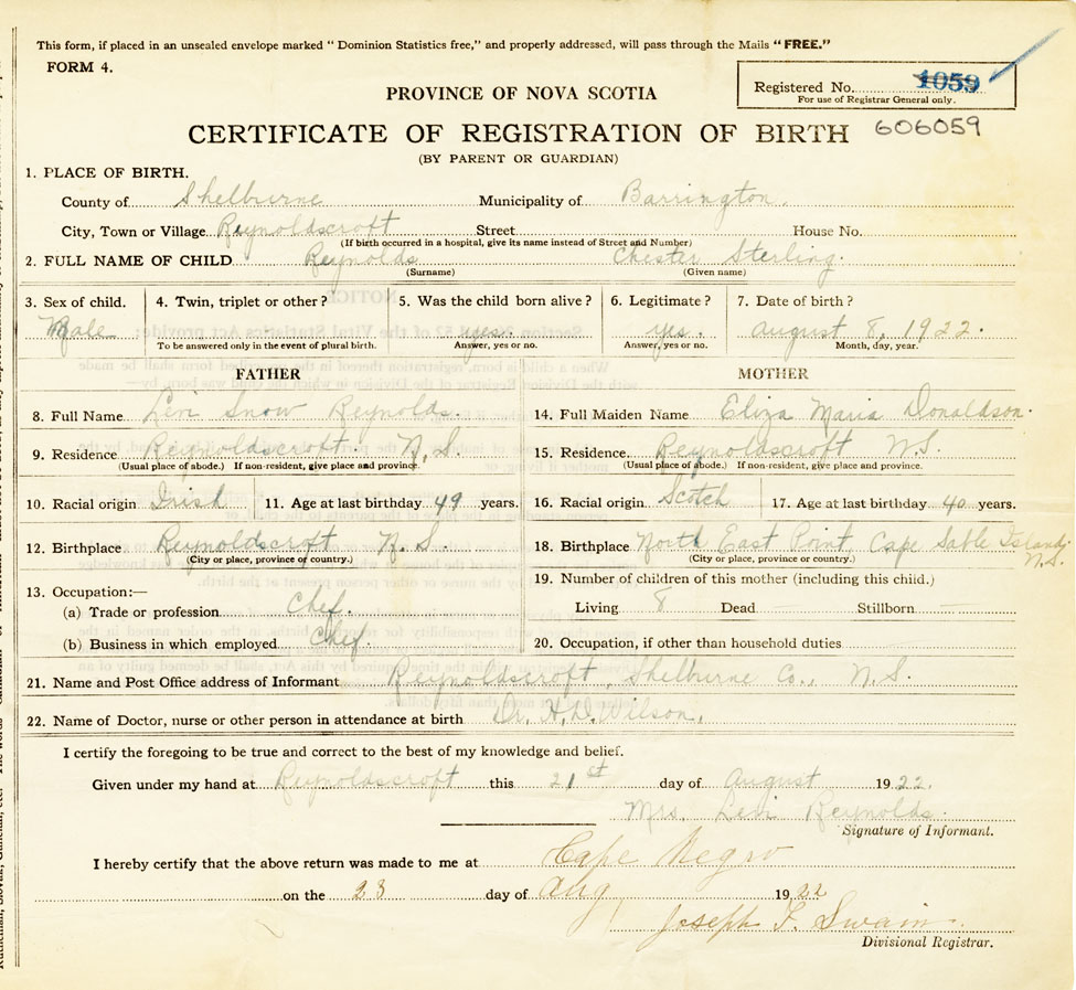 21. Name and Post Office address of Informant Mr Levi Reynolds Reynoldscroft Shelburne Co