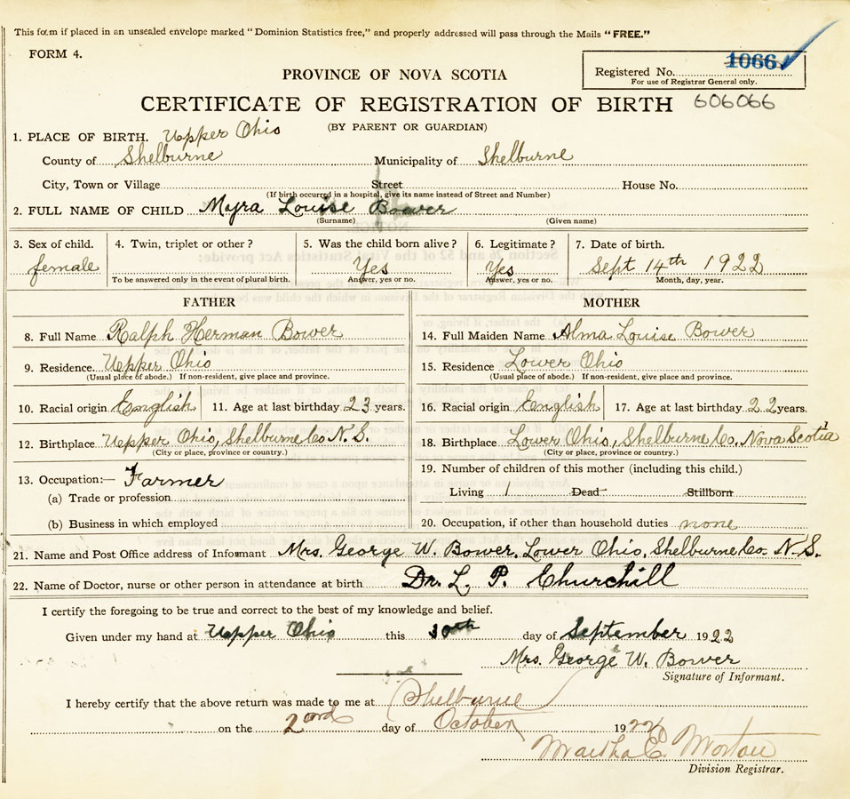 21. Name and Post Office address of Informant Mrs George W Bower Lower Ohio Shelburne Co