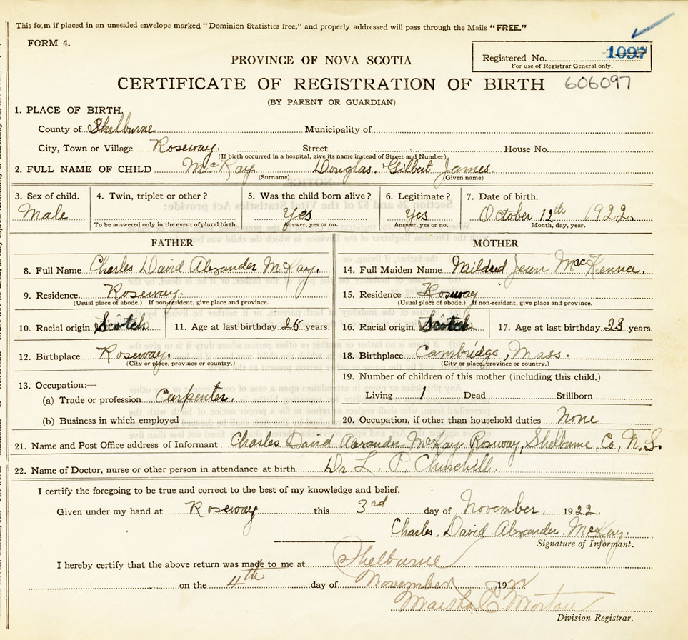 21. Name and Post Office address of Informant Charles David Alexander McKay Roseway, Shelburne Co