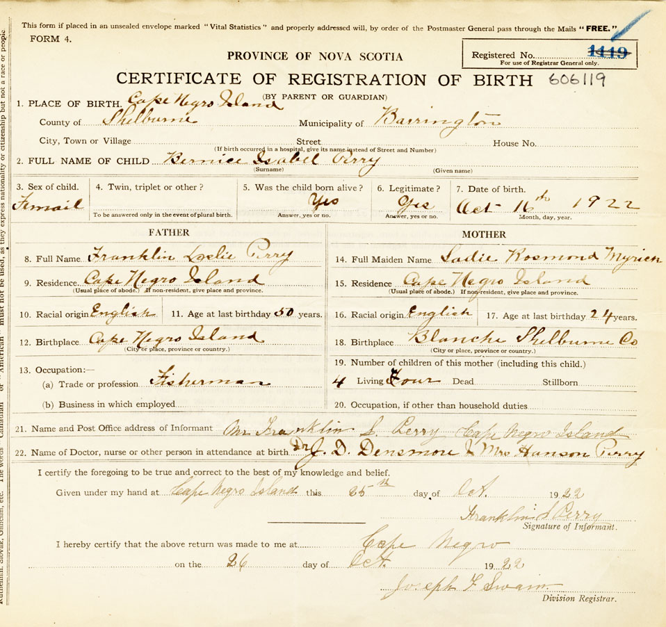 21. Name and Post Office address of Informant Mrs Franklin S Perry Cape Negro Island