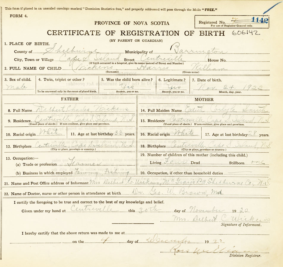 21. Name and Post Office address of Informant Mrs Delbert C Wickens McGrays PO, Shelburne County