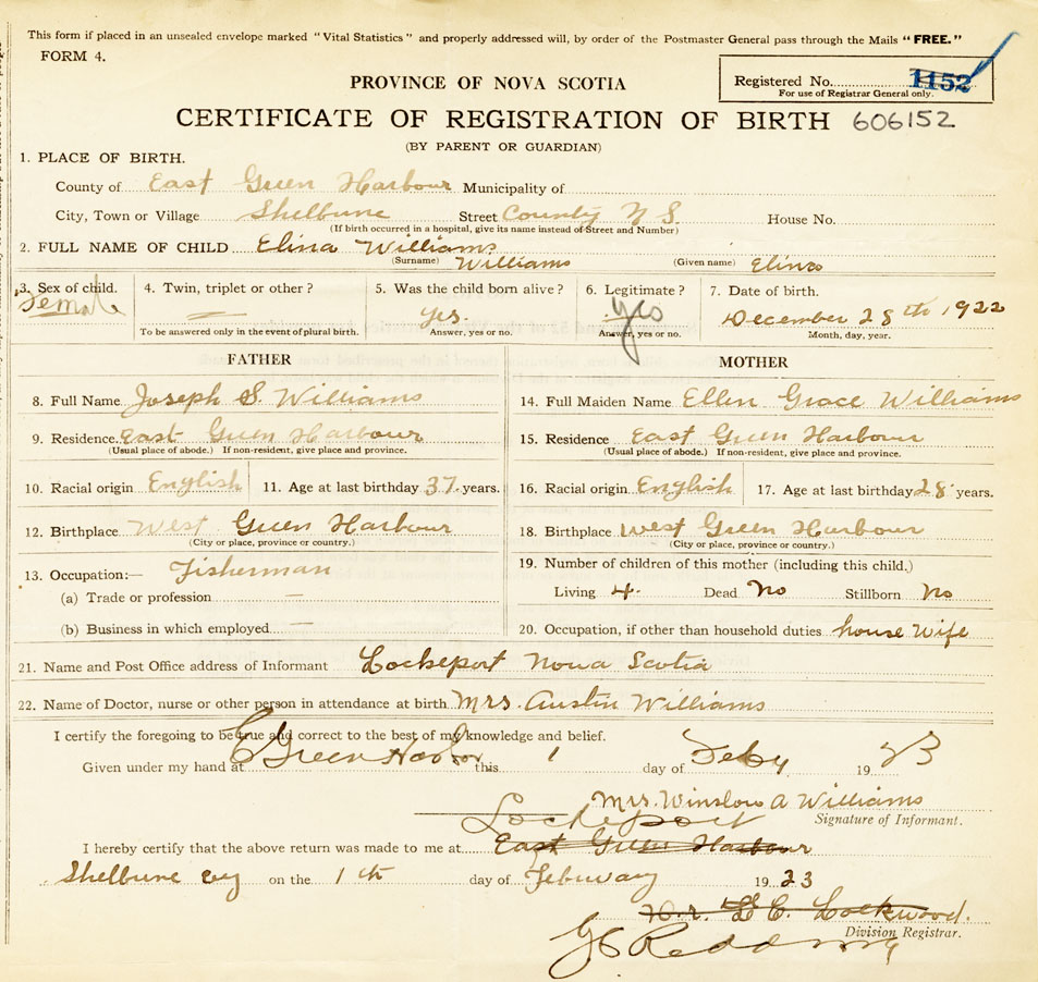 21. Name and Post Office address of Informant Mrs Winslow A Williams Lockport Nova Scotia