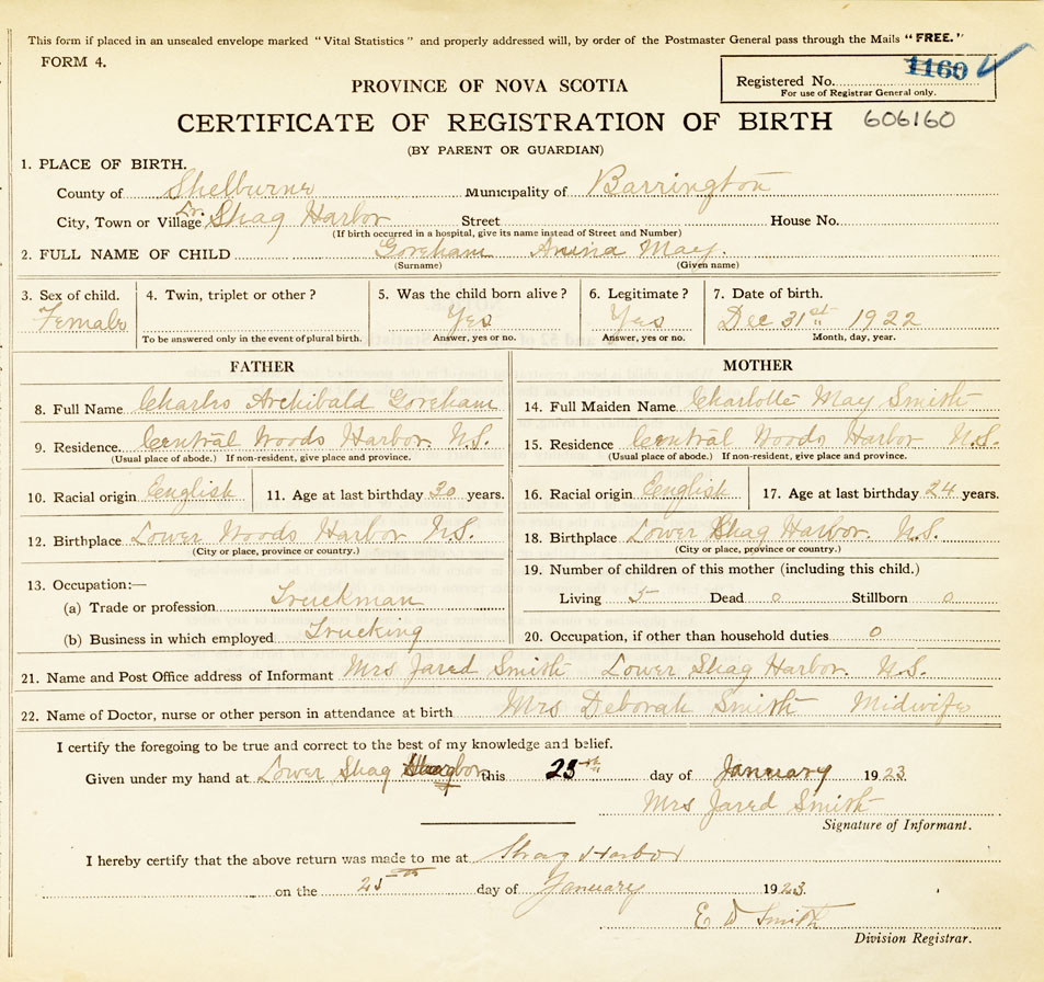 21. Name and Post Office address of Informant Mrs Jared Smith Lower Shag Harbour