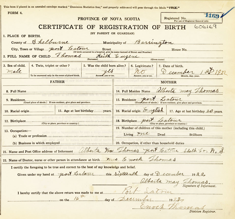 21. Name and Post Office address of Informant Alberta May Thomas Port LaTour Shelburne Co