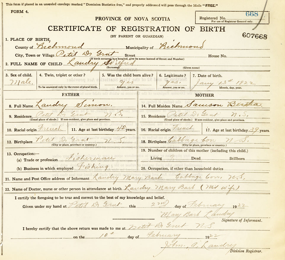 22. Name of Doctor, nurse or other person in attendance at birth Mary Barbe Landry (Midwife)