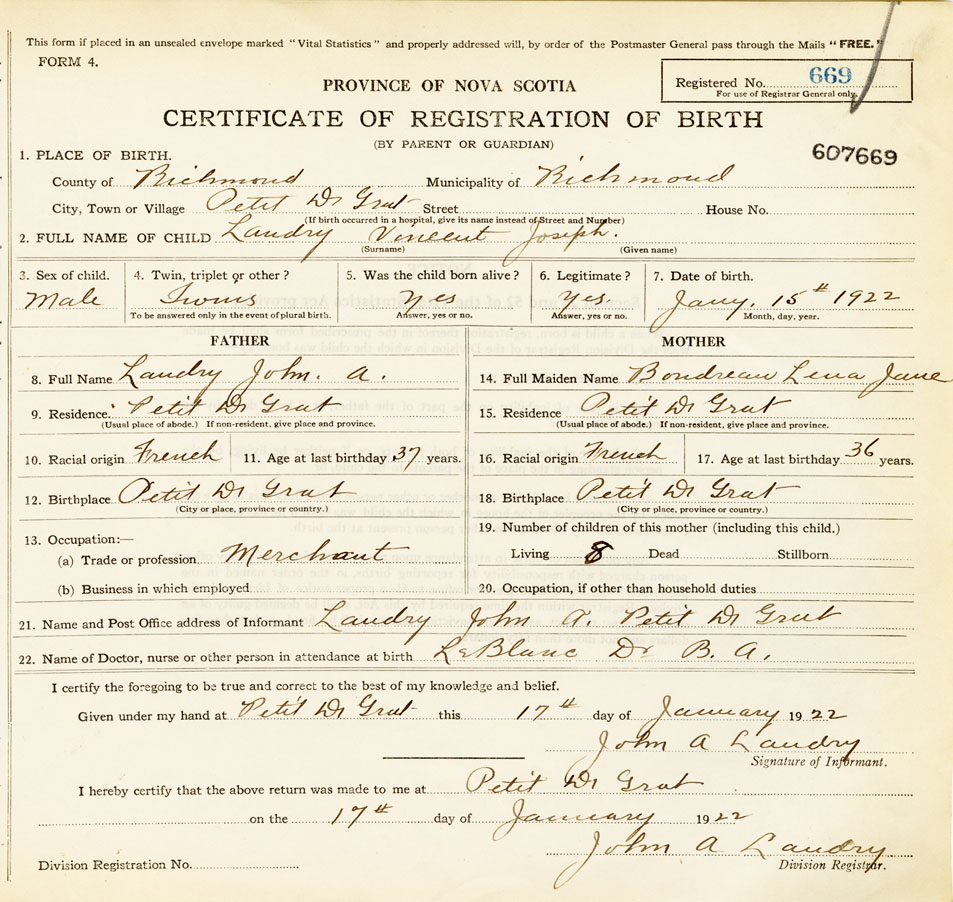 22. Name of Doctor, nurse or other person in attendance at birth Dr. B.A LaBlanc