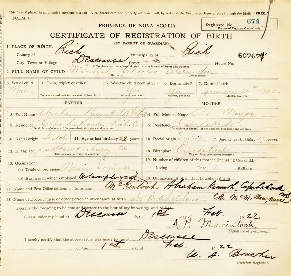 22. Name of Doctor, nurse or other person in attendance at birth Dr. B.A LeBlanc, E.B McMillan Nurse