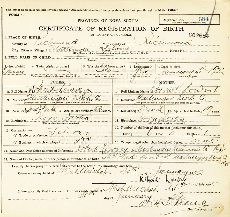 22. Name of Doctor, nurse or other person in attendance at birth Mrs Fredrick Boudreau