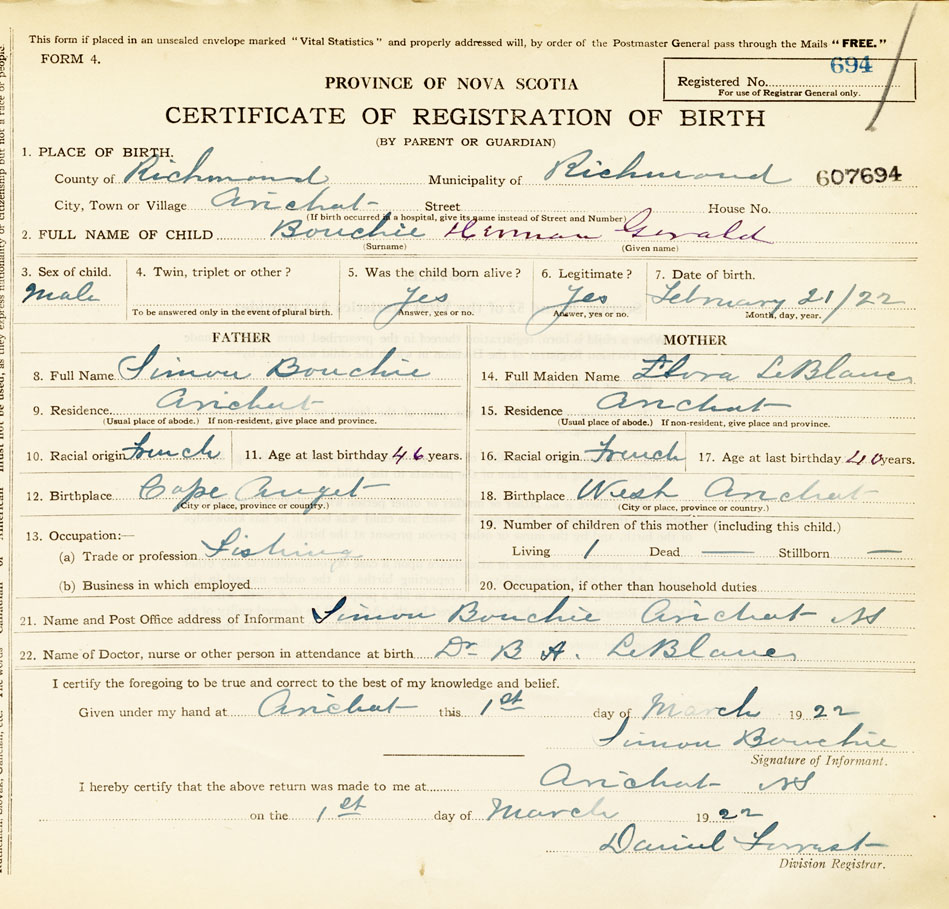 22. Name of Doctor, nurse or other person in attendance at birth Dr. B.A. LeBlanc