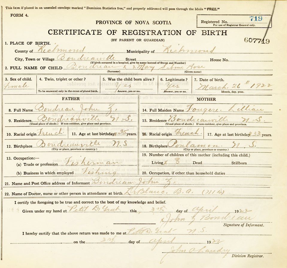 22. Name of Doctor, nurse or other person in attendance at birth LeBlanc B.A M.D.
