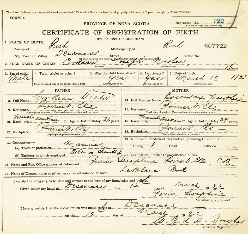21. Name and Post Office address of Informant Seraphine Poirier Poirierville, Isle Madame, Cape Breton