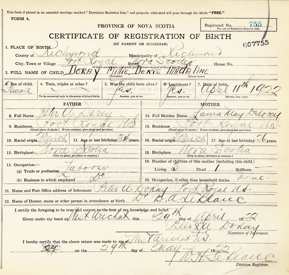 22. Name of Doctor, nurse or other person in attendance at birth Dr. BA LeBlanc