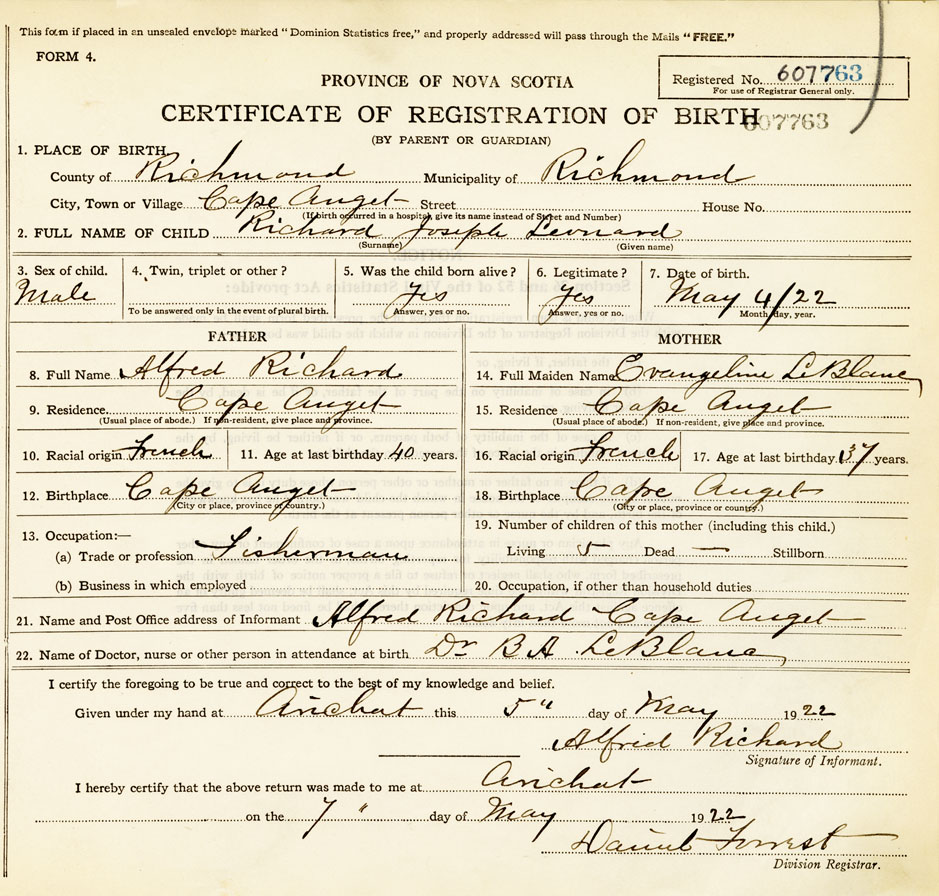 22. Name of Doctor, nurse or other person in attendance at birth Dr. B.A LeBlanc