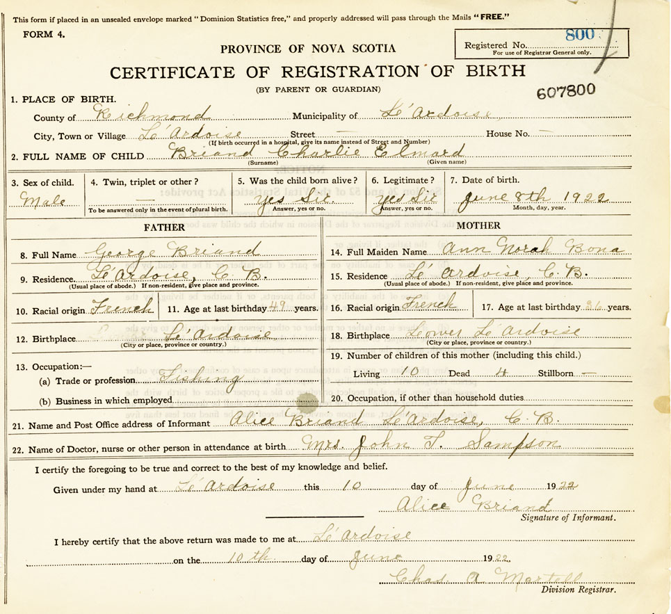 21. Name and Post Office address of Informant Alice Briand L'Ardoise, Cape Breton