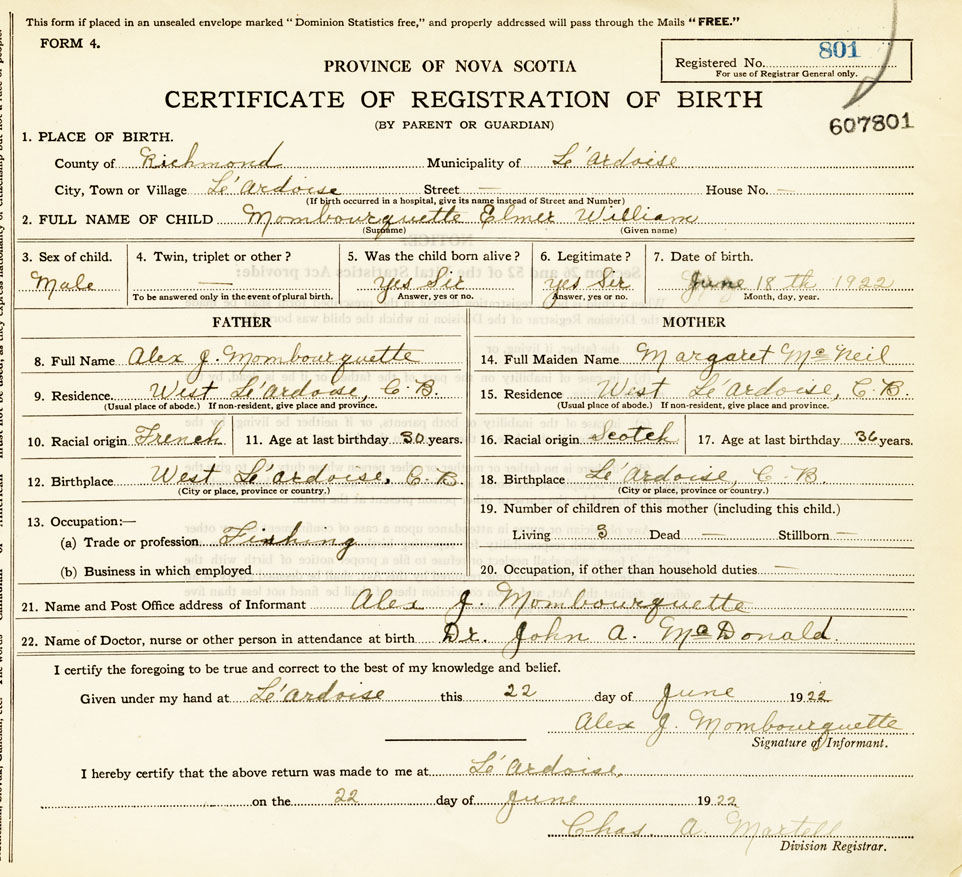 21. Name and Post Office address of Informant Alex J. Mombourquette West L'Ardoise, Cape Breton