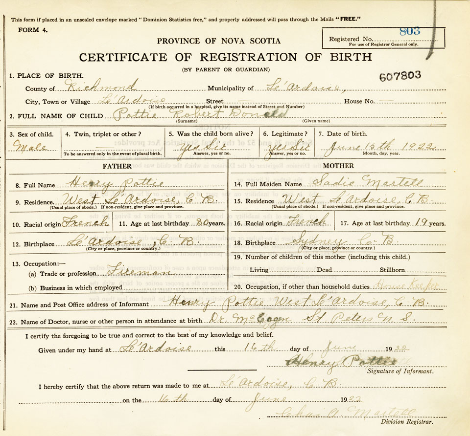 21. Name and Post Office address of Informant Henry Pottie West L'Ardoise, C. B.