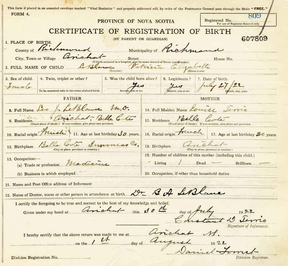 22. Name of Doctor, nurse or other person in attendance at birth Dr. B. A. LeBlanc