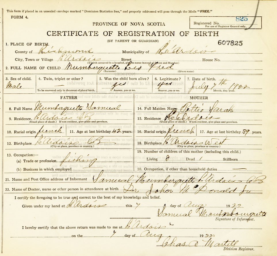 21. Name and Post Office address of Informant Samual Mumberquette L'Ardoise CB