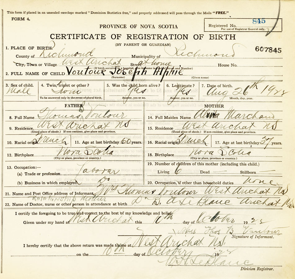 21. Name and Post Office address of Informant Mrs Thomas Voutour West Arichat