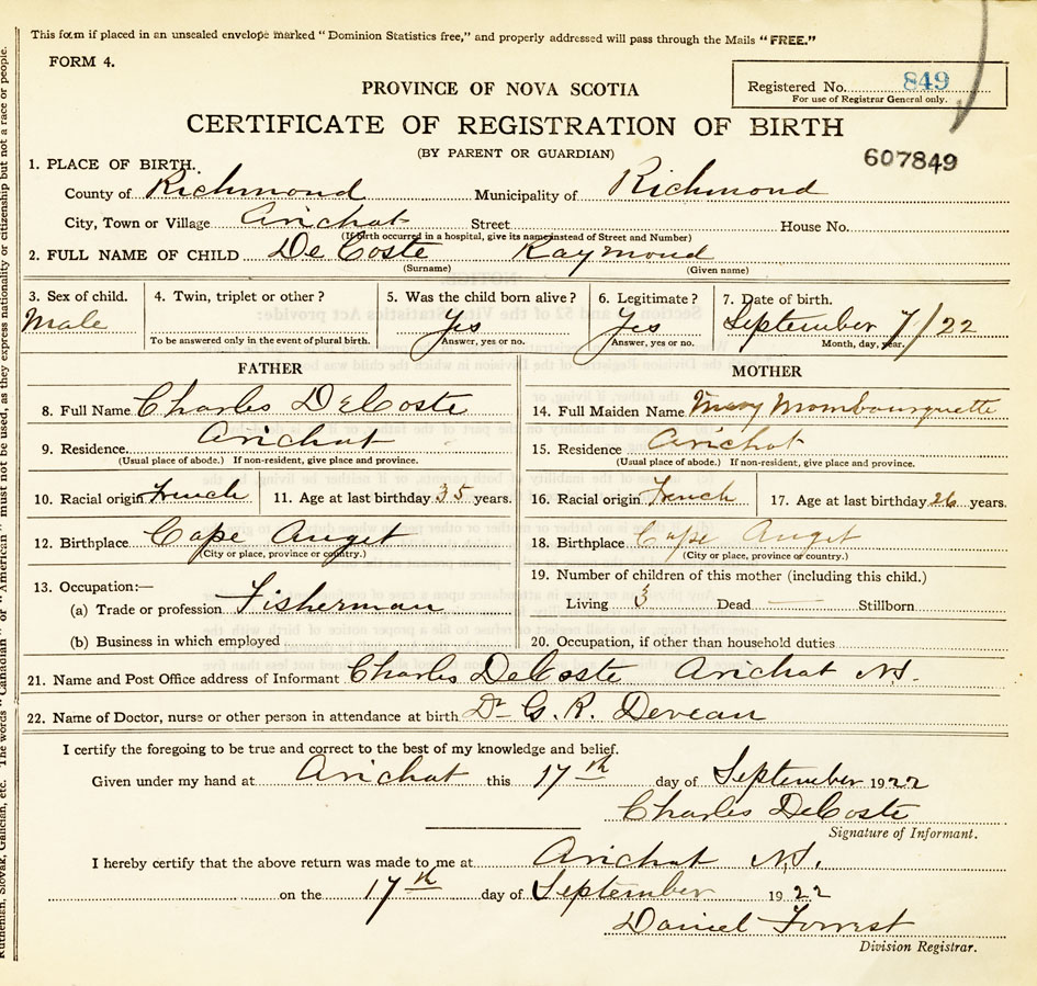 22. Name of Doctor, nurse or other person in attendance at birth Dr. G.R Deveau