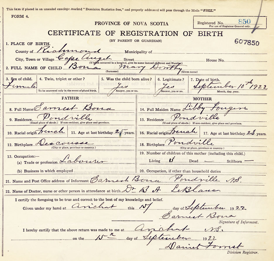 22. Name of Doctor, nurse or other person in attendance at birth Dr. B.A LeBlanc