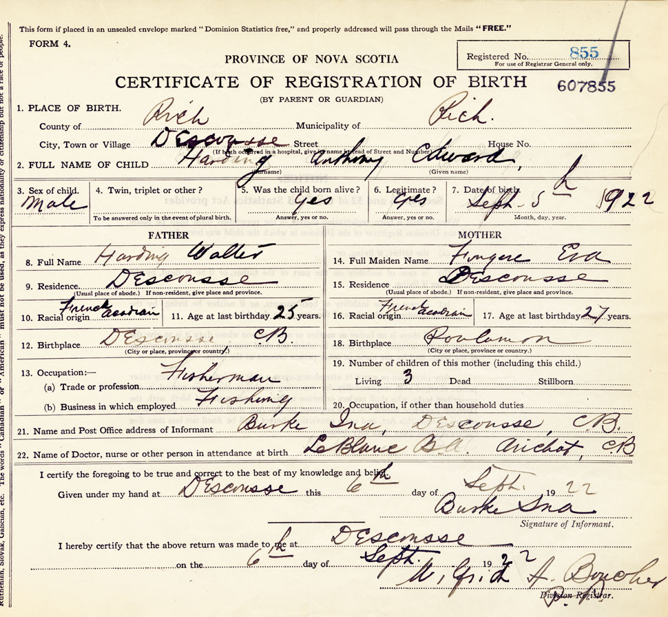 22. Name of Doctor, nurse or other person in attendance at birth Dr. BA LeBlanc, Arichat