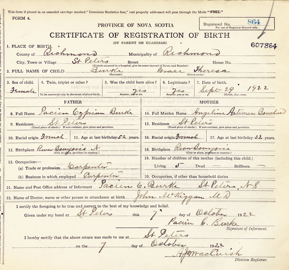 21. Name and Post Office address of Informant Pacien C Burke Saint Peters, Canada