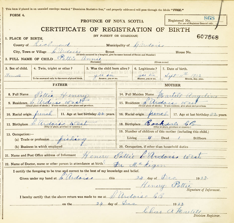 21. Name and Post Office address of Informant Henry Pottie L'Ardoise West