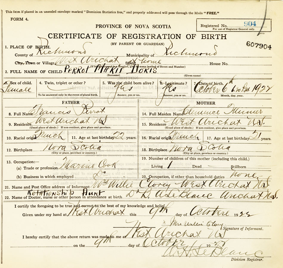 21. Name and Post Office address of Informant Mrs Willie Clorey (Aunt) West Arichat