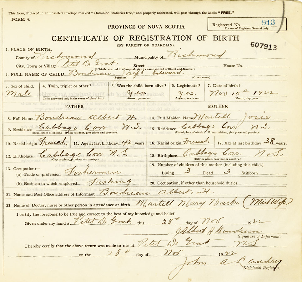 21. Name and Post Office address of Informant Albert H Boudreau Cabbage Cove