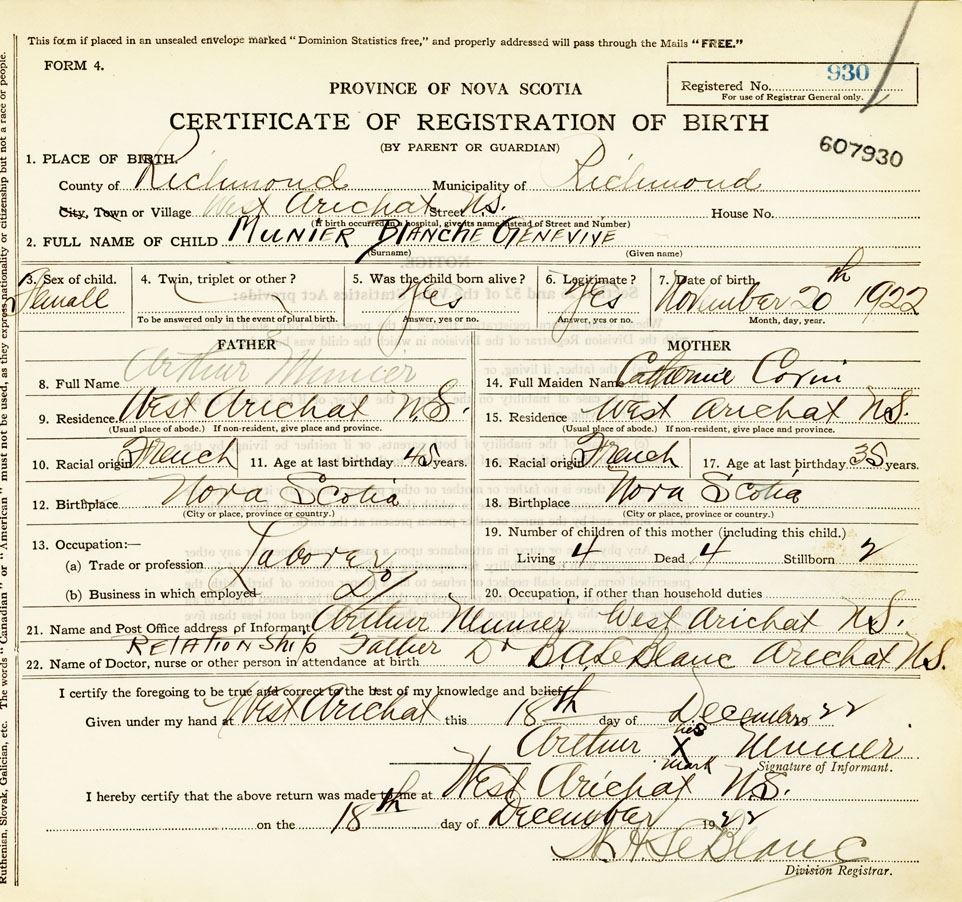 21. Name and Post Office address of Informant Arthur Munier West Arichat