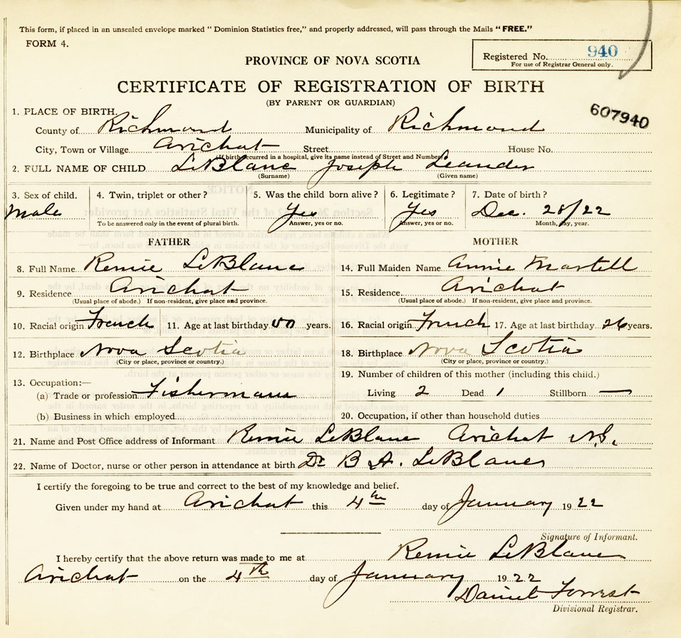 22. Name of Doctor, nurse or other person in attendance at birth Dr. B.A LeBlanc