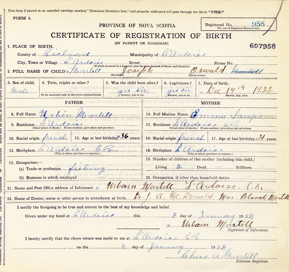 21. Name and Post Office address of Informant Urbain J Martell L'Ardoise