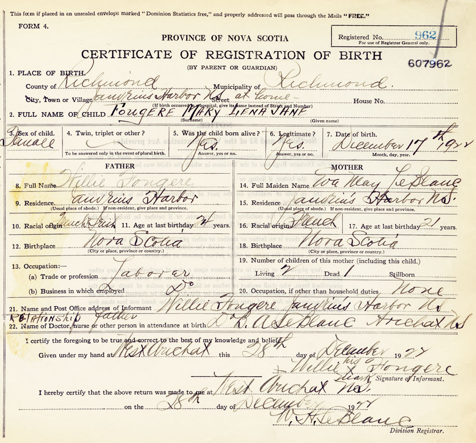 22. Name of Doctor, nurse or other person in attendance at birth Dr. B.A LeBlanc