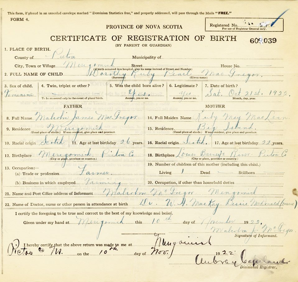 22. Name of Doctor, nurse or other person in attendance at birth Dr. W.A MacKay Nurse Bessie McDonald