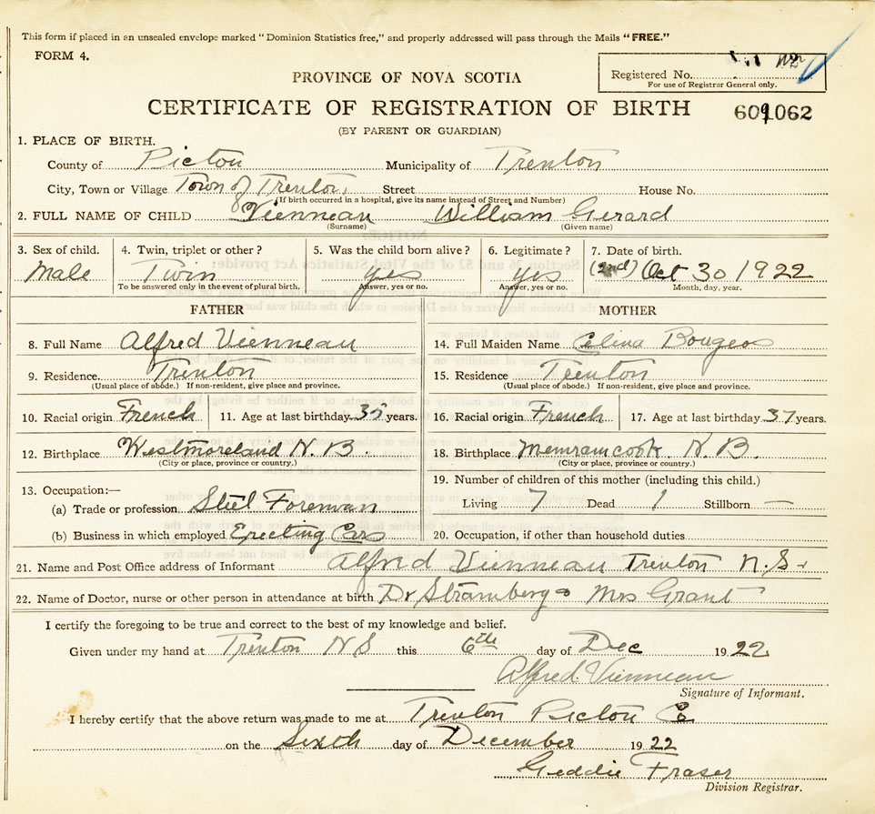 21. Name and Post Office address of Informant Alfred Vienneau Trenton N.S.