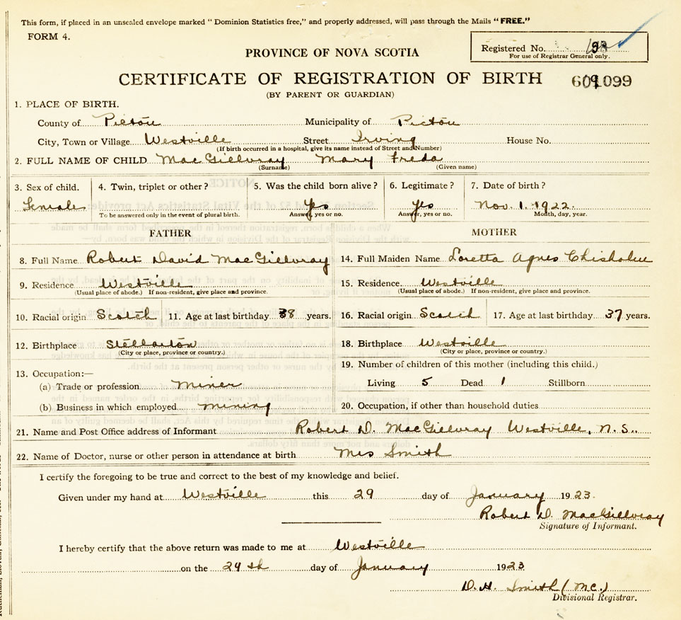 21. Name and Post Office address of Informant Robert D. McGillivray Westville, N.S