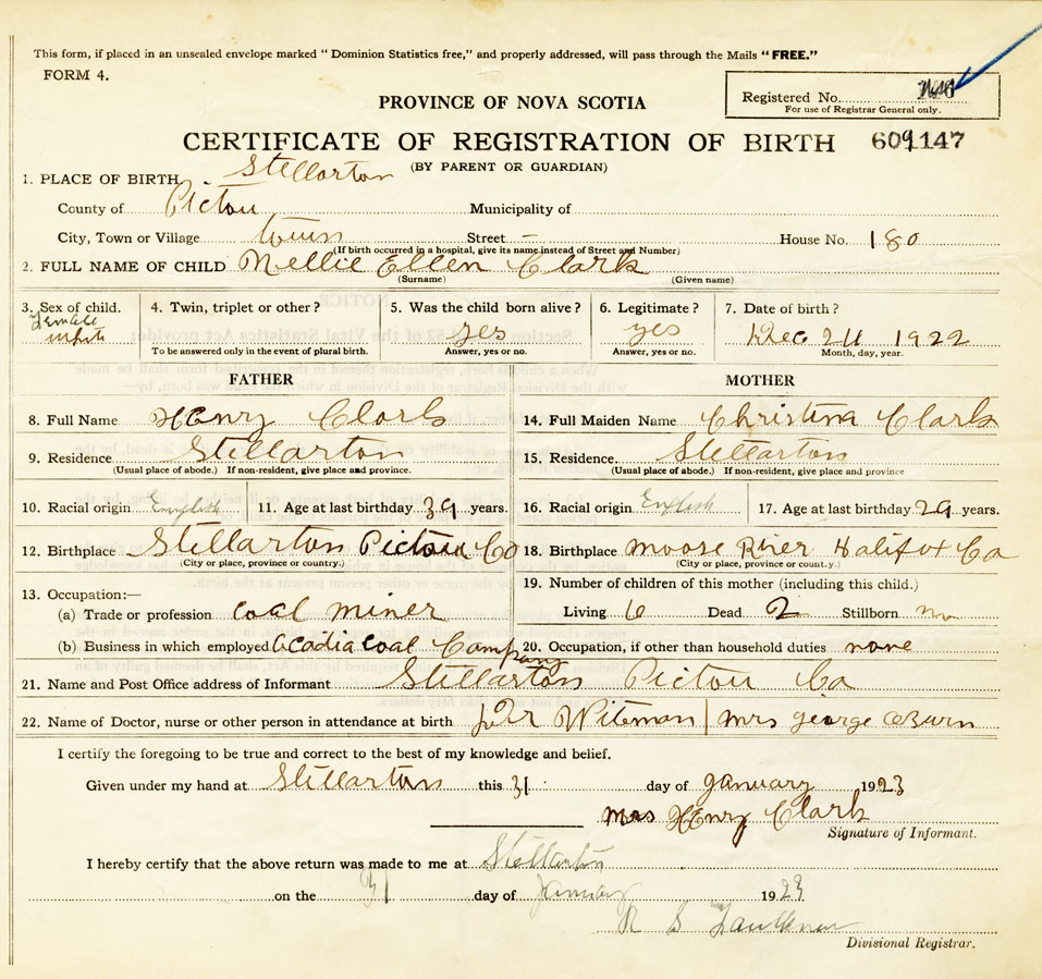21. Name and Post Office address of Informant Mrs Henry Clark Stellarton Pictou Co