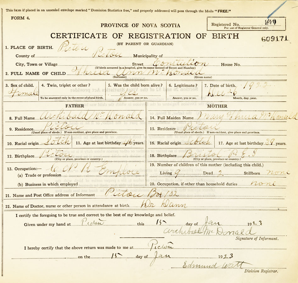 21. Name and Post Office address of Informant Archibald McDonald Pictou Box 102